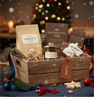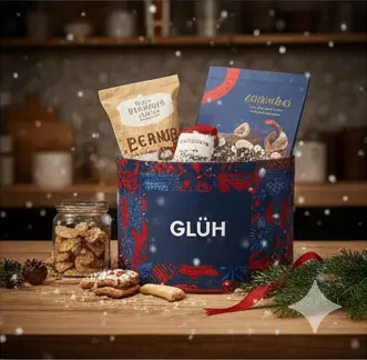 Cesta Gourmet GLÜH Festiva - Uma caixa encantadora repleta de chocolates deliciosos, guloseimas especiais e enfeites natalinos. O presente perfeito para celebrar momentos alegres em família!