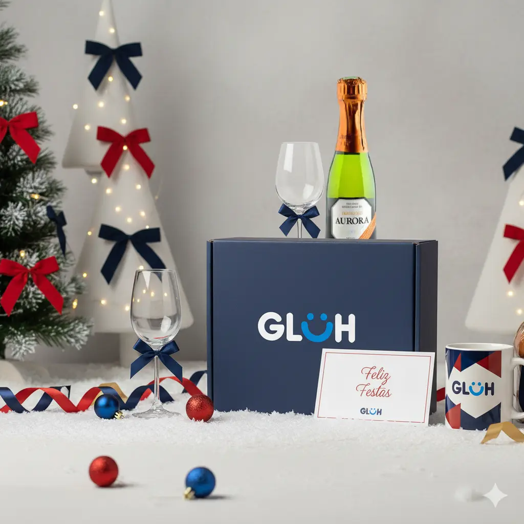 Caixa Especial de Natal GLÜH - Um kit encantador com laços vermelhos, uma bebida deliciosa e mimos incríveis. Perfeito para surpreender seus chefes e clientes queridos!